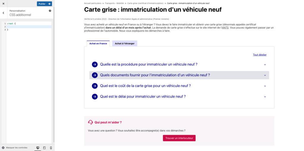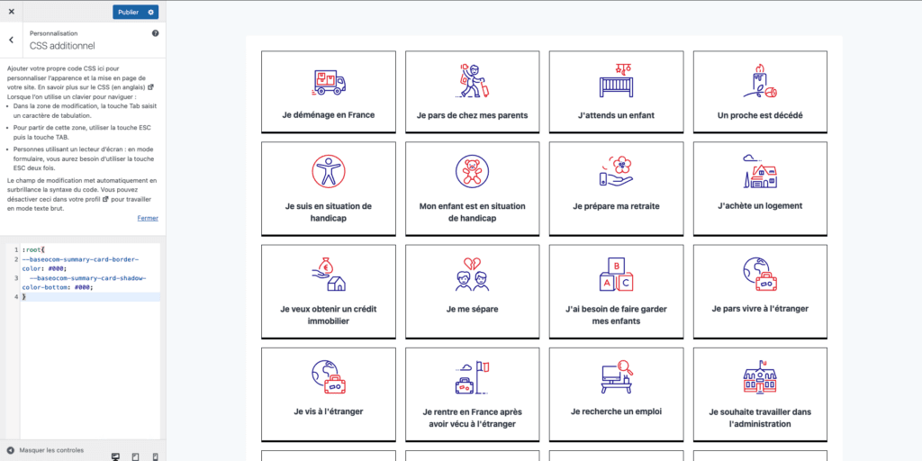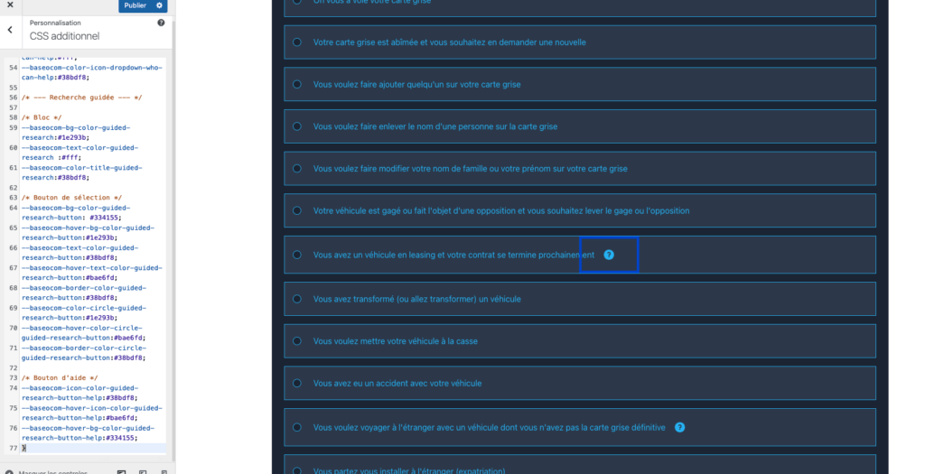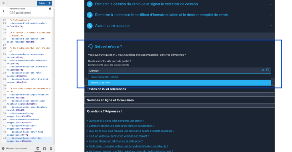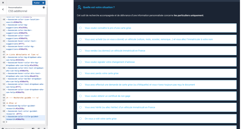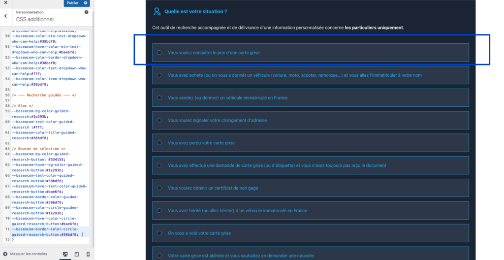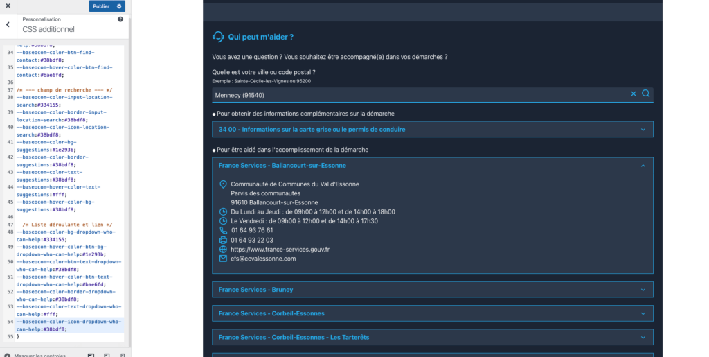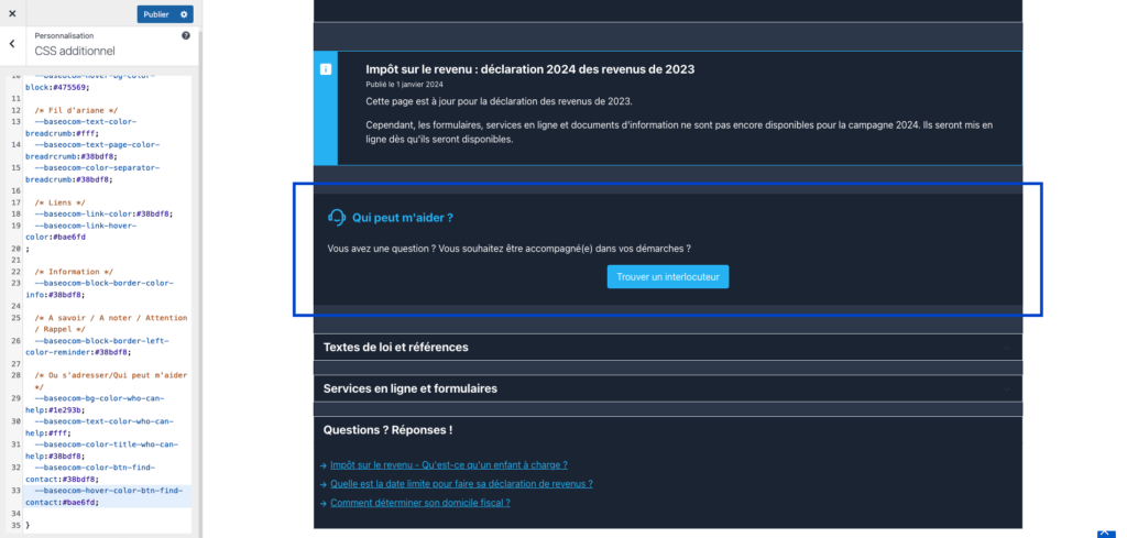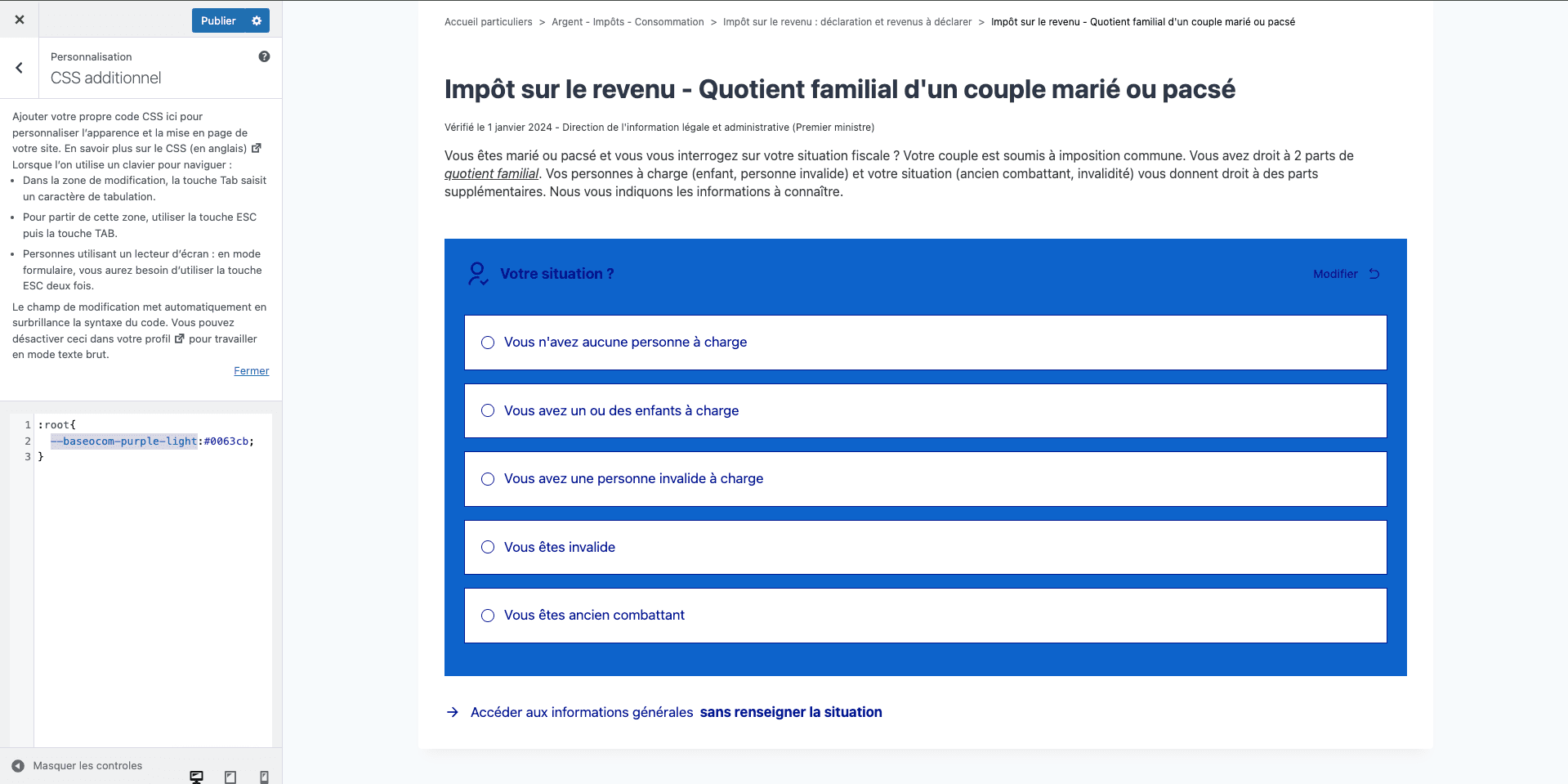 Dans cet exemple, j’ai modifié la couleur de la variable –baseocom-purple-light avec une couleur bleu à l’intérieur de la pseudo-classe root.